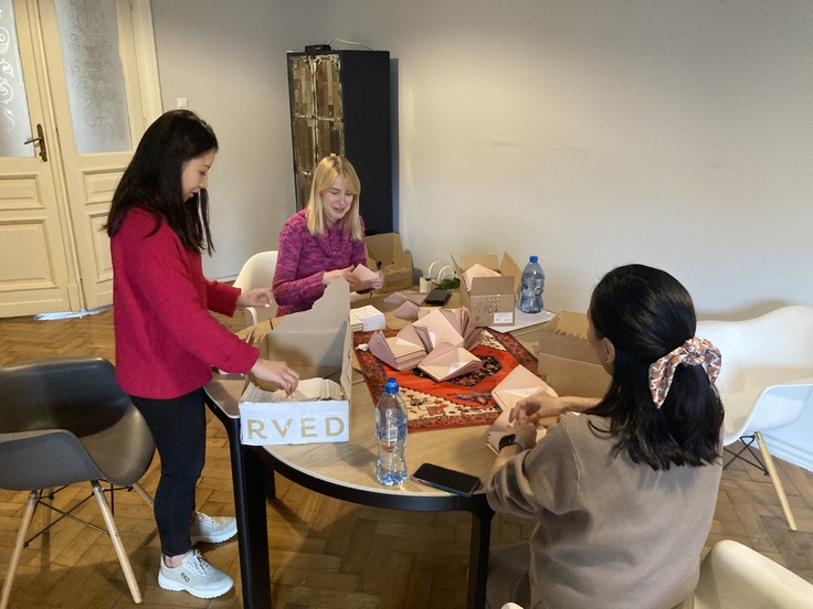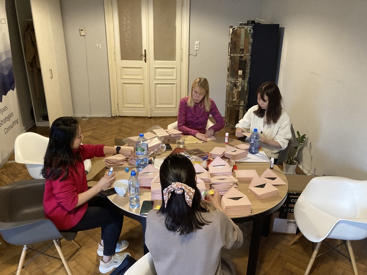 冬服購入用の商品券配布に向けて、福田会ポーランド支部スタッフとボランティアが、ナンバリングした商品券と今回の支援についてのウクライナ語の説明書の封入作業を行いました。
