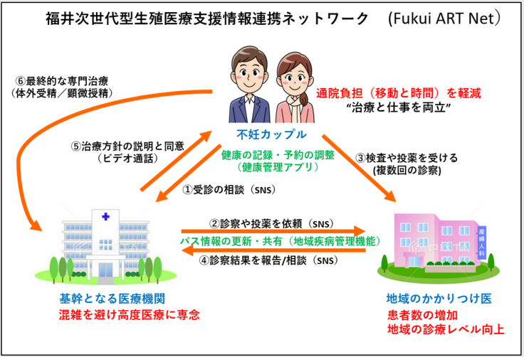 私たちは、くすりと検査は近くのかかりつけ医、人工授精や体外受精・顕微鏡受精は福井大学病院高度生殖医療センターに役割分担することで、患者さんの移動や負担を減らしつつ、最適な不妊治療を提供する「福井次世代型生殖医療支援情報連携ネットワーク(Fukui ART Net)」を、県内11の医療機関と協働し構築しています。現在、今冬に本格稼働できるよう試行錯誤しながらブラッシュアップを進めているところです。