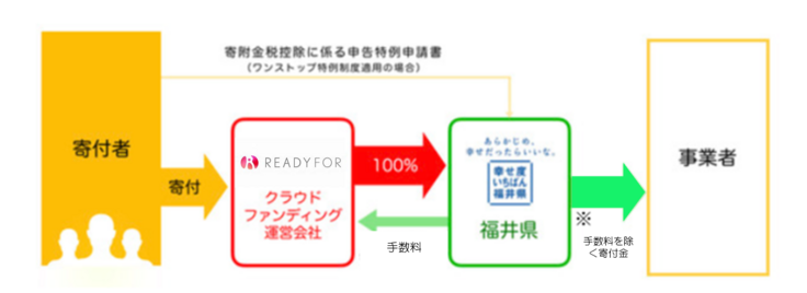 寄附金は福井県がふるさと納税として領収し、その寄附金から手数料を除いた額を、奨励金として事業者に支給します。