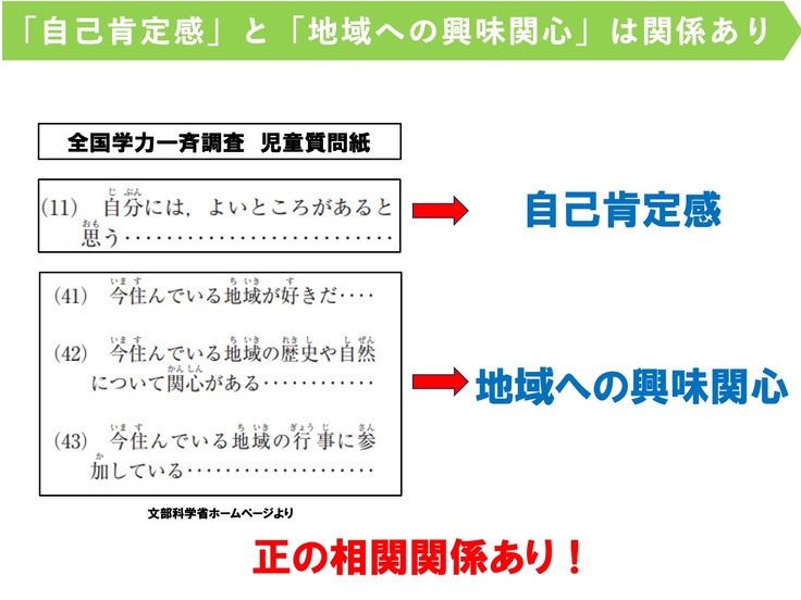 文部科学省が毎年行っている全国学力・学習状況調査によると、自己肯定感を問う質問「自分には良いところがあると思いますか」という質問に対して「そう思う」と答えた子は、地域への興味関心が強かったことが報告されています。