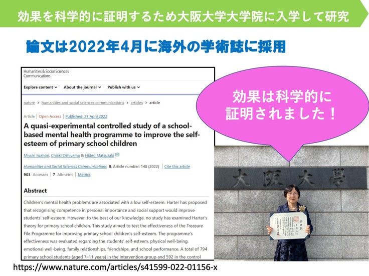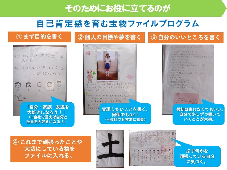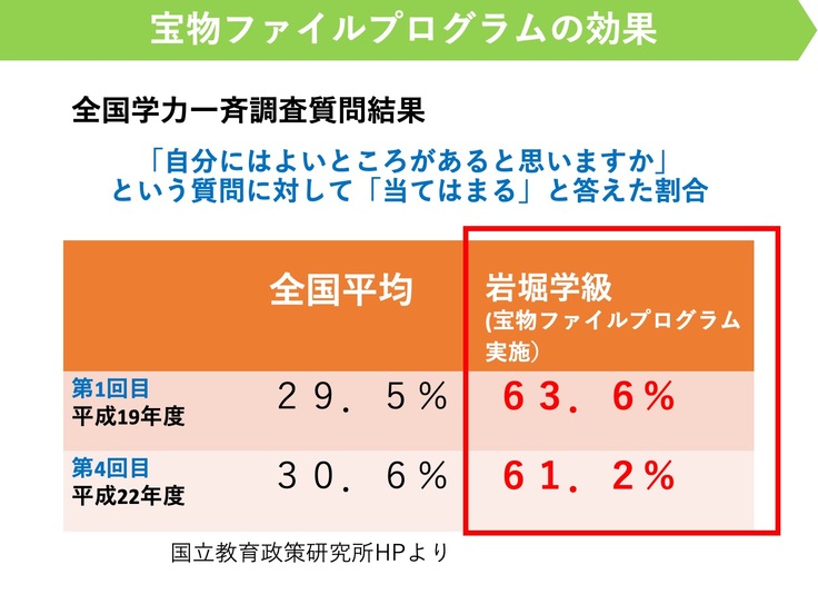 具体的には、自己肯定感を育てる「宝物ファイルプログラム」を開発して継続し続けたり、社会科でのふるさとめぐりや道徳での郷土愛の育成などの授業を行ったりして、一生懸命に子ども達を育ててきました。