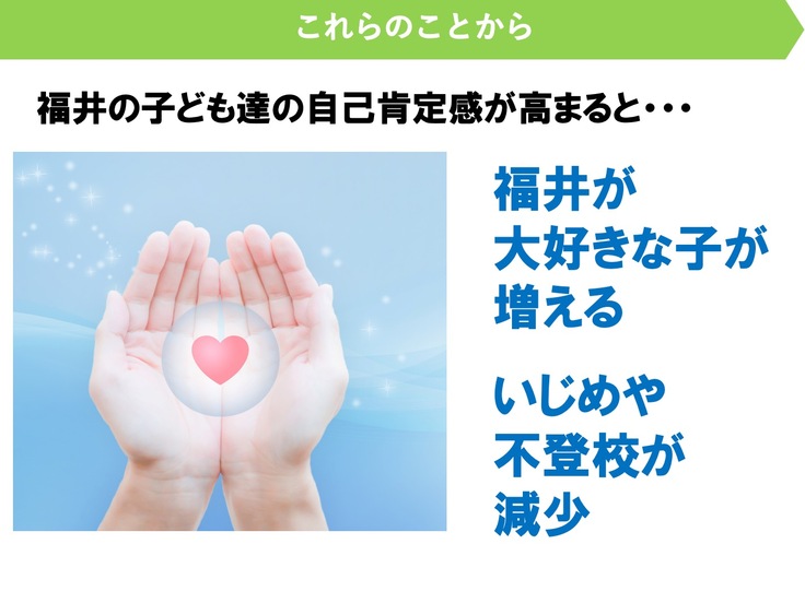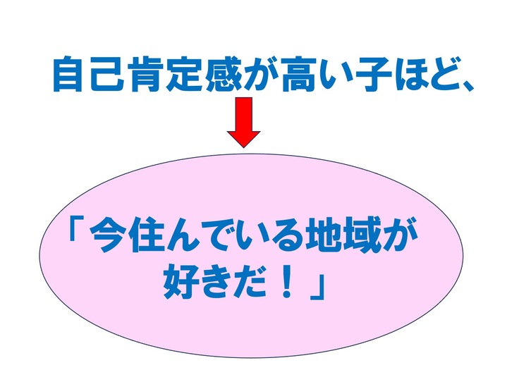 つまり、「福井県のことが大好きで他県で学んでも将来は福井県に帰ってきて住みたい!」という子に育てるためには、まず、子ども達の自己肯定感を高めて、自分のことも家族や友達のことも大好きな子を育てることが大事であるということです。