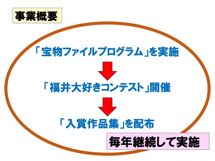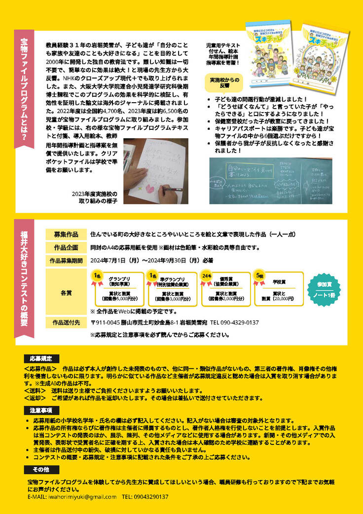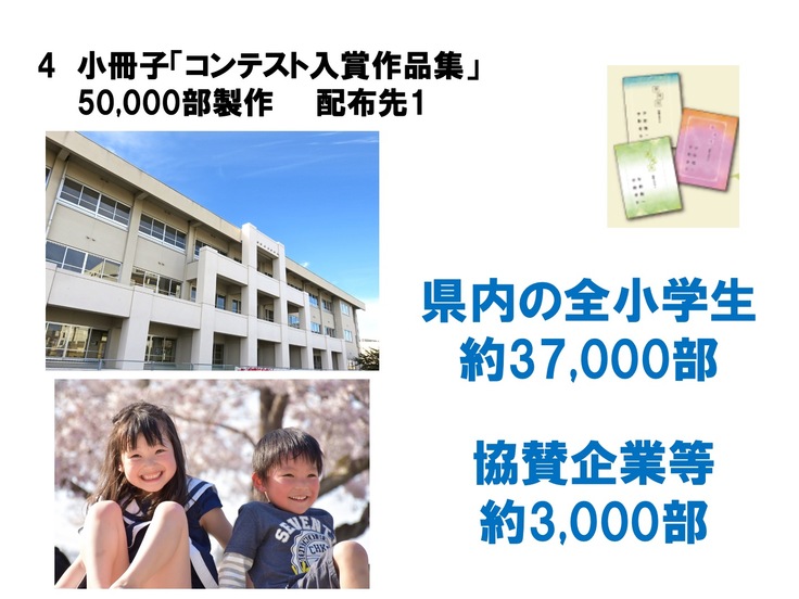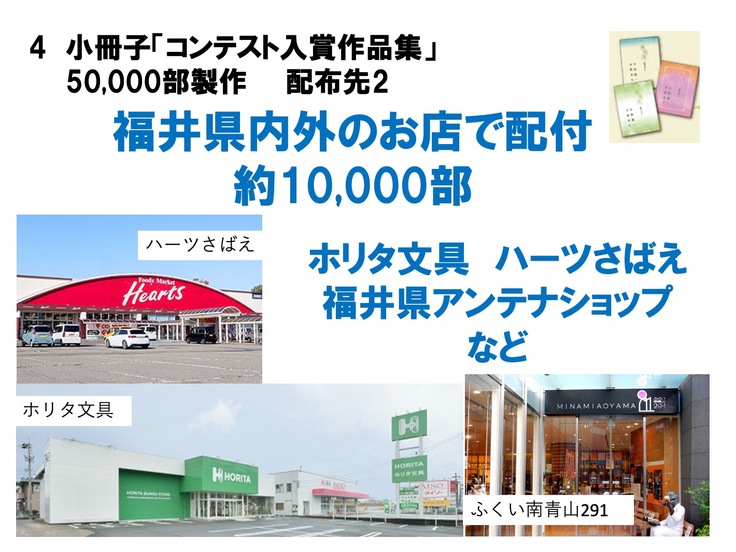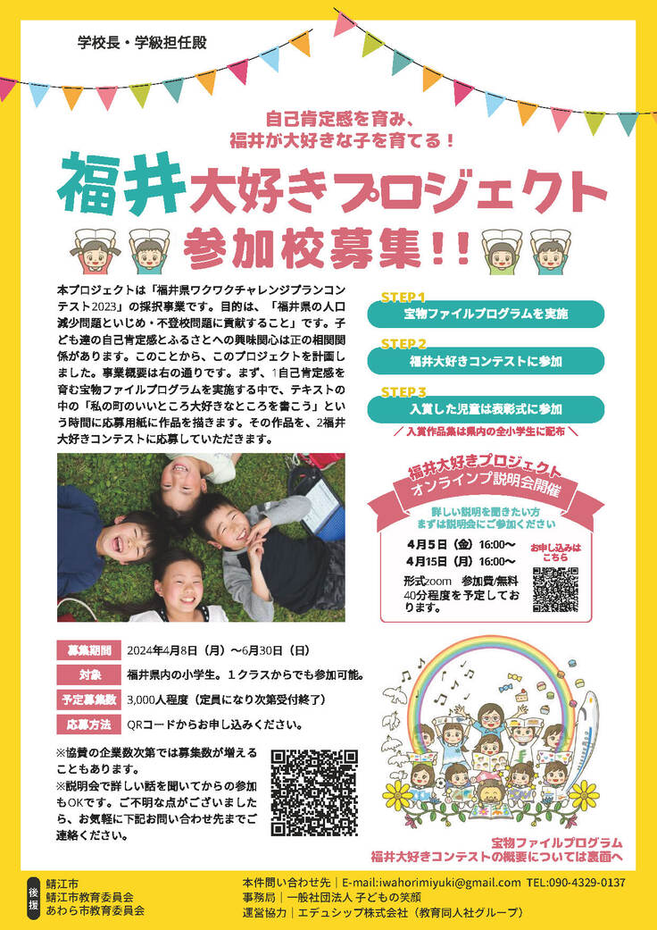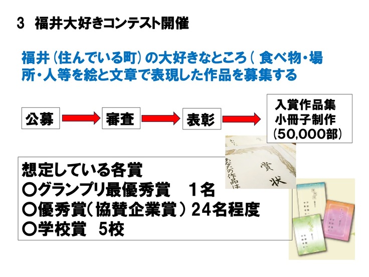 ・適切に配布先を決定出来る理由:「福井大好きプロジェクト」は、福井県「令和5年度福井県民ワクワクチャレンジコンテスト女性部門」採択事業です。また、今回実施する「福井大好きコンテスト」は、福井県教育委員会から後援を受けています。コンテストへの応募校募集時に、同プラットフォームを通じ、福井県内の全小学校へのFAX配信を実施済であり、冊子についても同様に配送にてお届けすることが問題なく可能です。なお、冊子に掲載する「入賞作品」は、賛同いただいた企業様や有識者による審査会を通し、各賞を選考いたします(審査会実施日:2024年10月23日、表彰式:12月7日)。