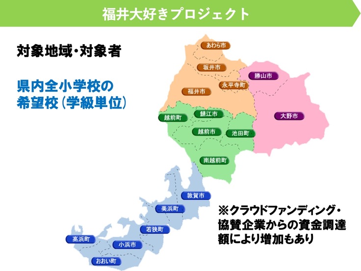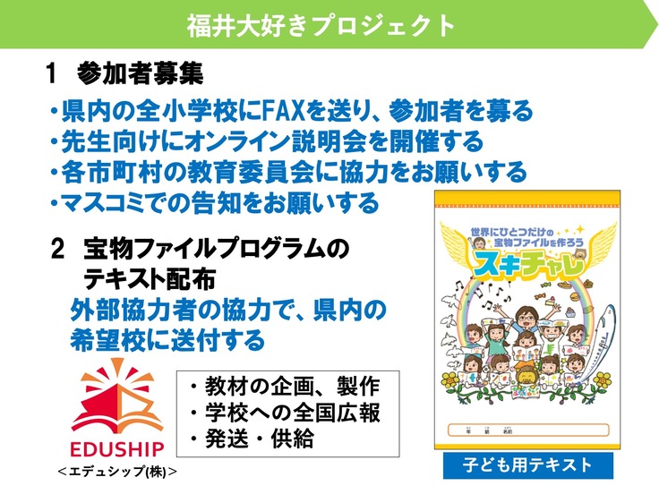 ・方法:株式会社エデュシップが構築しているDBSプラットフォーム(学校専用の教材配送サービス)を通し、福井県内の各市町の小学校を通じて各児童にお届けします