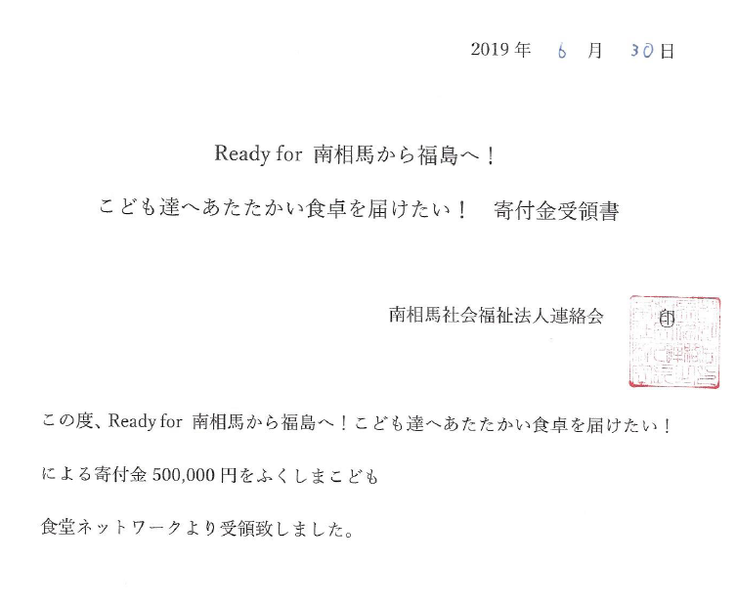 2019/3/1~4/19に実施した「南相馬から福島へ!こども達へあたたかい食卓を届けたい!」にご支援くださいました皆様へ、プロジェクトが完了しましたのでご報告させて頂きます。