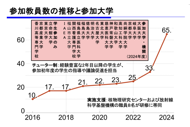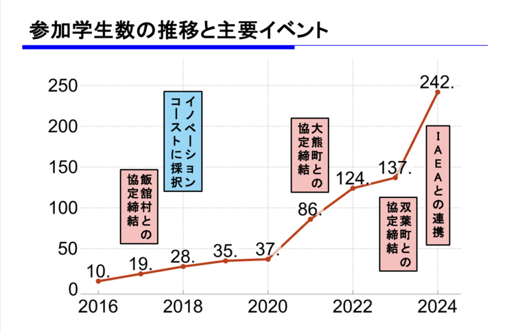 「福島浜通り環境放射線研修」は当初、10名の参加者からスタートしましたが、文系・理系を問わない参加条件と、全員が能動的に参加できる研修内容が好評を博し、現在では全国18の大学から215名もの学生が参加するまでに成長しました。
