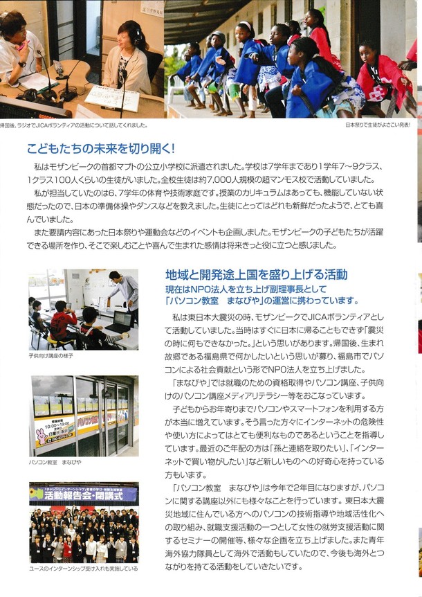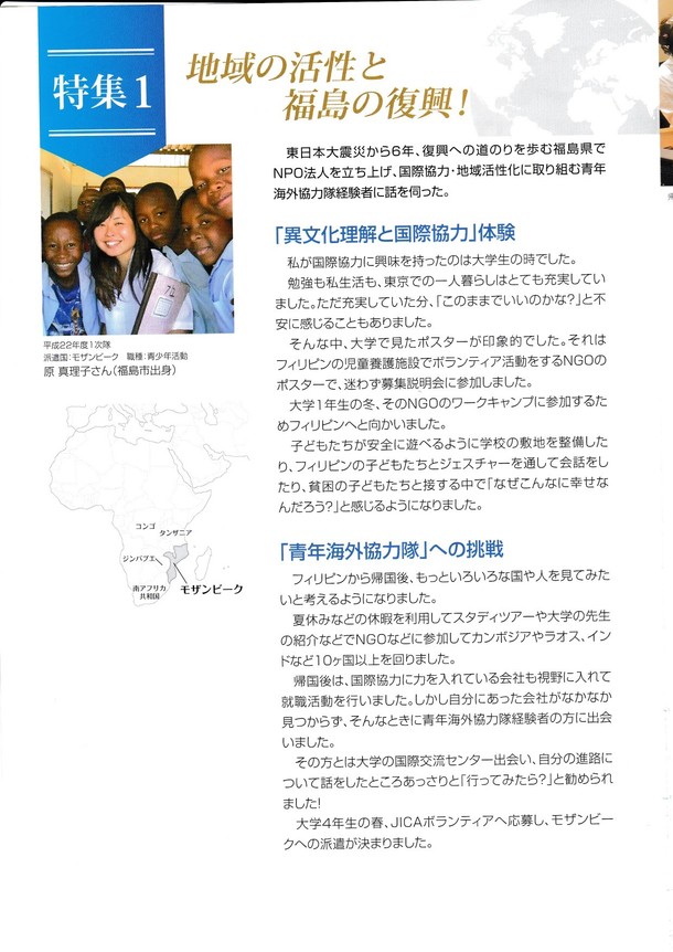 JICAの情報紙にNPO法人の活動とスタッフの真理子さんの記事が掲載されました。