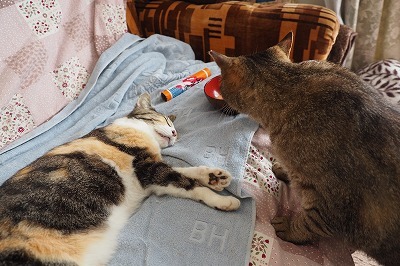 ▲いつもこんな感じで、人なれしている他の猫が私たちにスリスリしているのを見ていました。