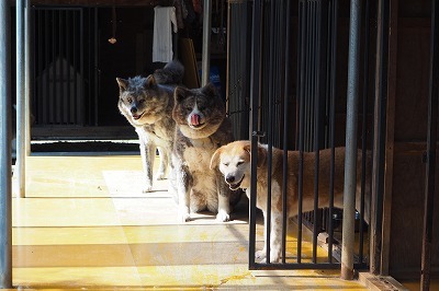奥が秋田犬の「紬」と「小町」、そしてビビりん坊の「カフェ」。