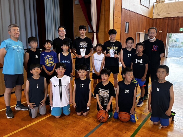 部員達は、それぞれ出身のミニバスチームへ岡山インターハイの出場報告をするとともに、小学生の後輩達と交流をし、バスケットボールの普及活動も行いました。激励金もいただき、後輩達も県を代表する先輩たちとバスケットボールをすることができ、今後のレベルアップのための励みになったようです。