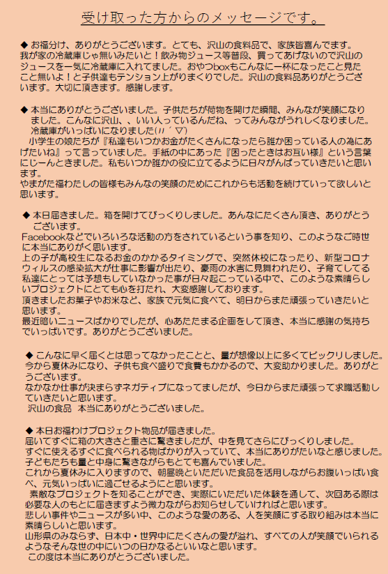 2020年度は、山形県内約500世帯に緊急食料支援のプロジェクトを行いましたが、政府の支援だけでは生活が苦しい、前年度の年収やふたり親世帯、学生等、支給の条件に合わず支援が受けられない方も多くその方々からも、「プロジェクトで食料がいただけて助かった」という声が多く寄せられました。