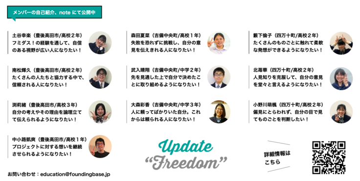 僕たちは今はまだ、それぞれ日本の地方に住むたった1人の中高生ですが、このプロジェクトを通して成長し、地域や、誰かのために、挑戦できる人になります!
