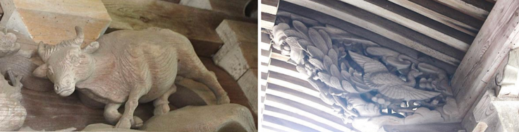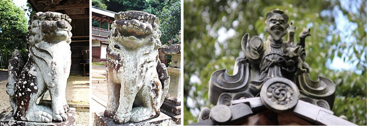 幸い、豪雨の際にも本殿や神輿蔵などは災いを逃れることができました。本殿には数多くの彫刻があります。これらを見るだけでも時が経つのを忘れてしまいそうなほど。また、本殿前の狛犬は、江戸時代、安政四年(1857)に奉納されたものです。地元の誇る名石工・難波金兵衛(なんばきんべえ)が、「伊助」という銘を入れて彫っています。神輿蔵の屋根の鬼瓦は、他に例を見ないデザインです。まるで、牛頭天王が、疫病の象徴である小鬼を抱えて諫めているように見えます。