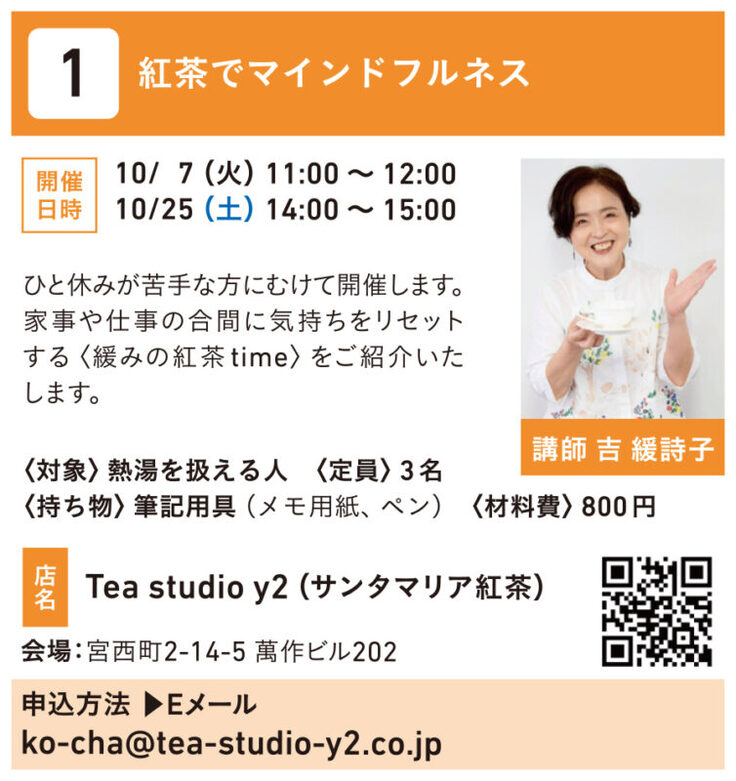 むさし府中まちゼミで、吉さんの講座(番号1:紅茶でマインドフルネス)が開催されます!9/17(明日)からの申し込みとなります。定員3名と限定人数でのご案内なので、是非お早めにお申し込みを^^
