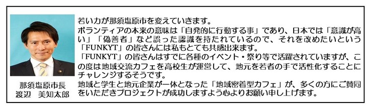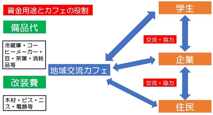 地元企業の寄付やカフェ内の「寄付ボックス」に頂いた市民の方の善意によって、地域と学生と地元企業が一体となった「地域密着型カフェ」として運営していき、私たちFUNKYTの活動を地元に発信するための「草の根運動の拠点」となればと思っています。