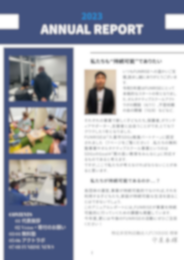 さて、令和5年度のアニュアルレポート(年度報告書)が完成いたしました。今回はこちらで表紙の感じをご覧いただきます。(ここではモザイクですみません...代表挨拶はぜひ実物でご覧くださいませ)