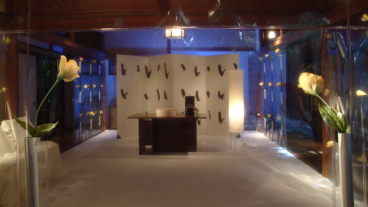 例えば、爲三郎記念館「大桐の間」では襖をはずし、フラワースクリーンで囲った空間を作り出しました。数寄屋造りの『数寄屋』には、茶人好みの茶室、といった意味のほかに、「空き家」という意味もあります。日本建築は、襖や障子をはずしてしまえば、床と柱だけの何もない空間となります。そこに、今までとは別の建具をはめれば、今までとは全く異なる空間を作り出すことができます。透明なスクリーンは優しく空間を仕切り、中に入っても外の美しい庭園の景色を眺めることができます。一方で、やわらかな一枚のスクリーンによって囲われているだけで、落ち着きのある空間が生み出されるのです。