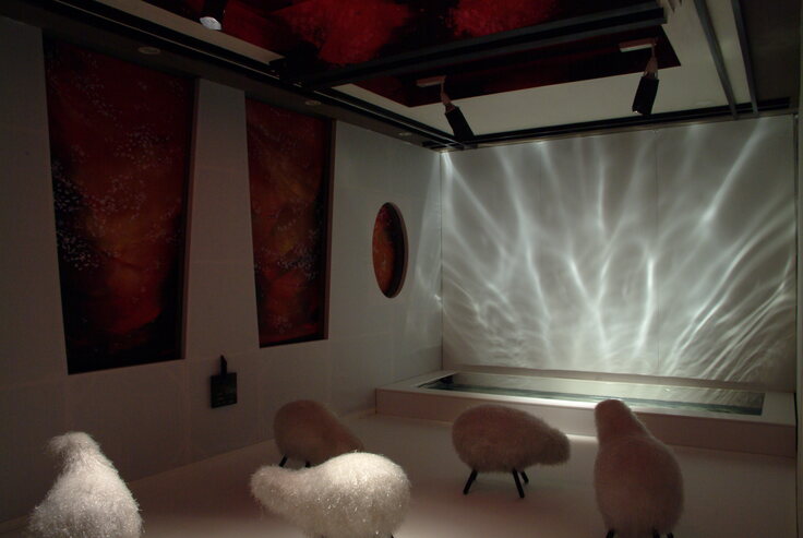 ここは、茶の湯にとって何よりも大切な『水』をテーマにした展示でした。茶の湯は水の文化ともいえます。水のゆらぎは、形のない形、予期せぬ形を見せ、光に照らし出された水のゆらぎは見る者を飽きさせません。
