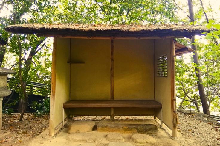 お茶のお庭にある待合は、お茶会を催した亭主(ていしゅ)が招き入れるまで、茶室に入る前にお客様がしばらく待って過ごすところです。普段見過ごしがちな場所ですが、ここに腰掛けてお庭を眺めたり、これから始まる茶会に思いを馳せたりすると、自然と心が落ち着くとともに、旅行前のわくわくするような気持になるから不思議です。