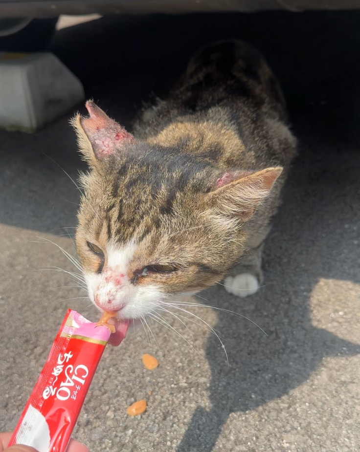 日が経つにつれて、その傷が耳の後ろのほうにも広がっていって、これはただの怪我じゃないかもと不安になり、もう一度捕まえるのは少し大変なので病院に動画を見せて相談したところ、おそらく蚊のアレルギーでしょうとのことで、塗り薬と飲み薬をもらうことができました。