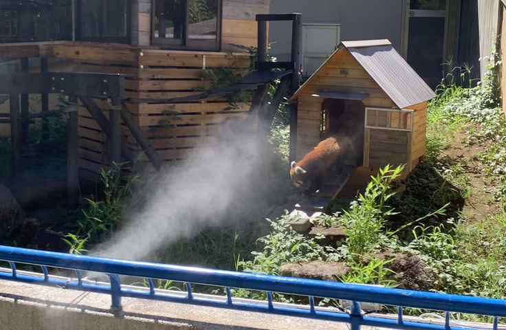 しばらくは屋外の小屋の中から見てはいたが、噴射の量を増やすと気になって近付くが、いつもとは違う刺激に少し驚いたようで一度お部屋に退散。
