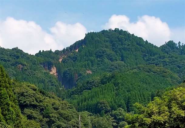 藤井さんのご自宅の裏の大きな山の写真。この頂上近くの茶色の部分が削がれ、流れてきたそうです。