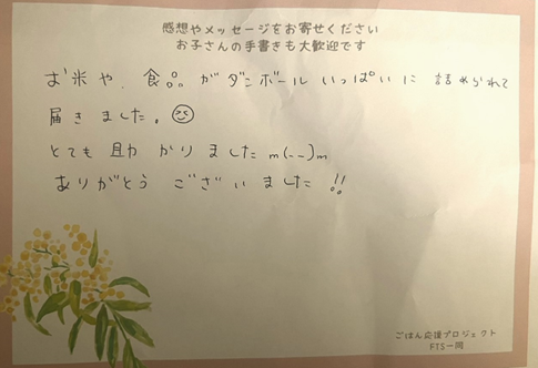 また1件あたり1000~1500円の発送料がかかるため、ふ~サポの皆様のご寄付を最大限に活用させていただいています!食品、ご寄付どちらも、本当にうれしく、励みになっております。この場を借りてお礼申し上げます。