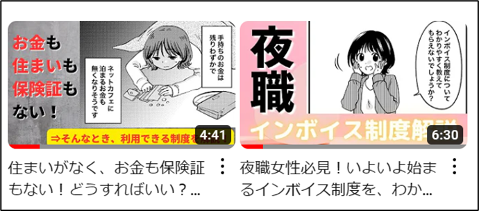 記念すべき第1弾は啓発マンガ「あしたの嬢」インボイス編を動画にアレンジしました。3月14日には、第2弾「住まいと保険証がない編」も公開!