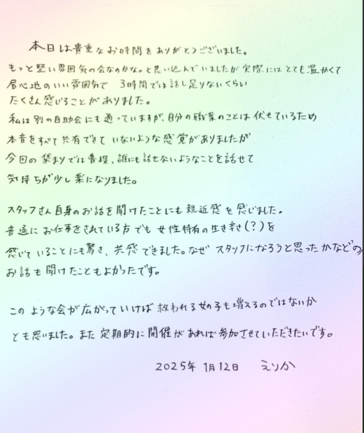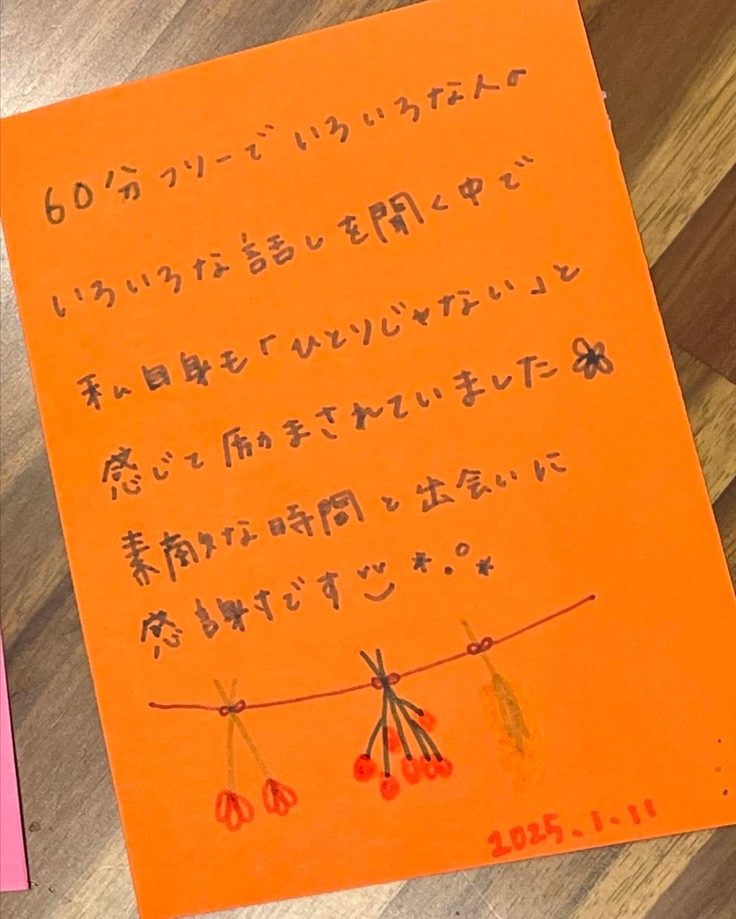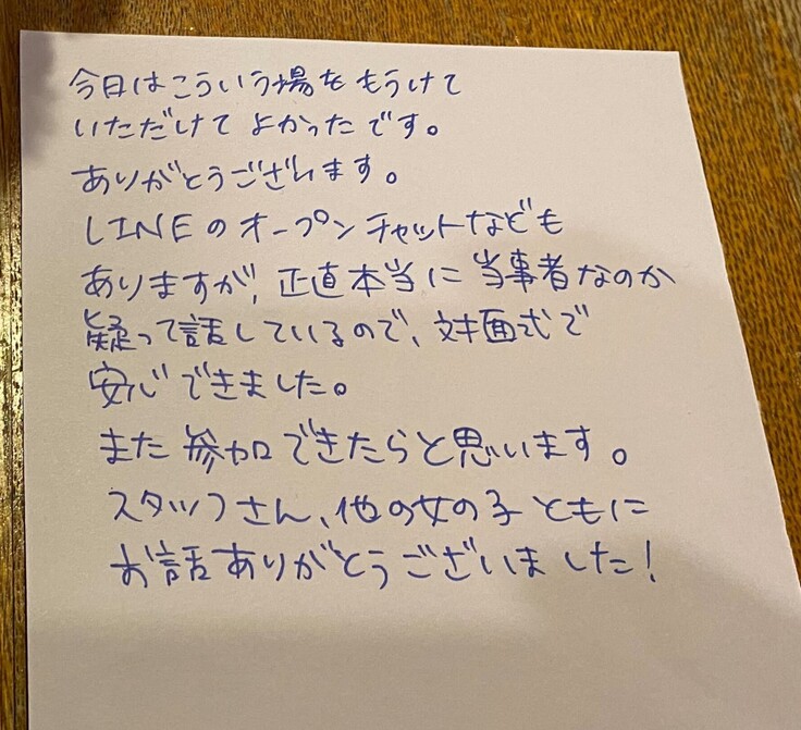 1月は、2人の方が参加してくれました。 お菓子・軽食をつまみながら、心のうちにあることを共有しました。最後にはみんなで、よい香りのハンドクリームを共有してそれぞれの場所に帰りました♪ 2月は、4人の方が参加してくれました!自己開示はとても勇気のいることですが、皆さん話せる範囲で、自分のこと、将来の目標などを素直な気持ちで語ってくださいました。 お互いの顔を見て話すことのできる対面開催は「自分だけじゃない」という連帯感・安心感を得やすいのではないかなと感じました。 これからも『女の子たちの60分フリー』が、風俗で働く女の子たちにとって安心できる場所になれたら嬉しいです。 参加者の方々に協力して頂き、参加した感想やこれからの目標、風テラスに対する想いなどをカードに残しました! 参加くださった方々、本当にありがとうございました。 |