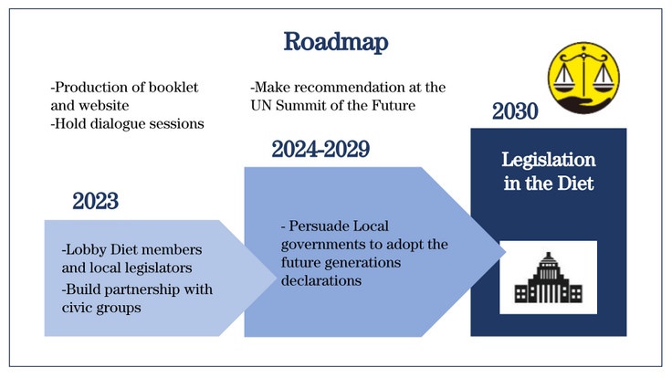Our goal is to enact the Future Generations Act in Japan, which requires state and local governments to think about the long-term effect of the laws and regulations and how they will impact future generations. We intend to make a recommendation at the “United Nations Summit of the Future” September 2024 in New York.