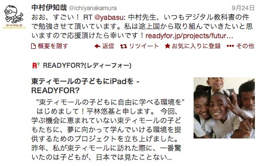 今回のプロジェクトを日本のICT教育推進に尽力されている中村伊知哉先生へTwitterで紹介をしたところ以下のコメントを頂きました!ICT教育は子どもの関心や学習効果において成果が発表されてきていますが、まだ日本もこれからの分野です。東ティモールへの導入で運用や効果について試行錯誤しながら、成果を出し、良い事例となれたらと思います。