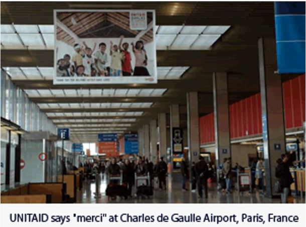 ★写真は、ユニットエイドの(航空券連帯税に対する)メルシー・バナーが掲げられたパリのシャルル・ド・ゴール国際空港(パリ空港公団のCSRとして)