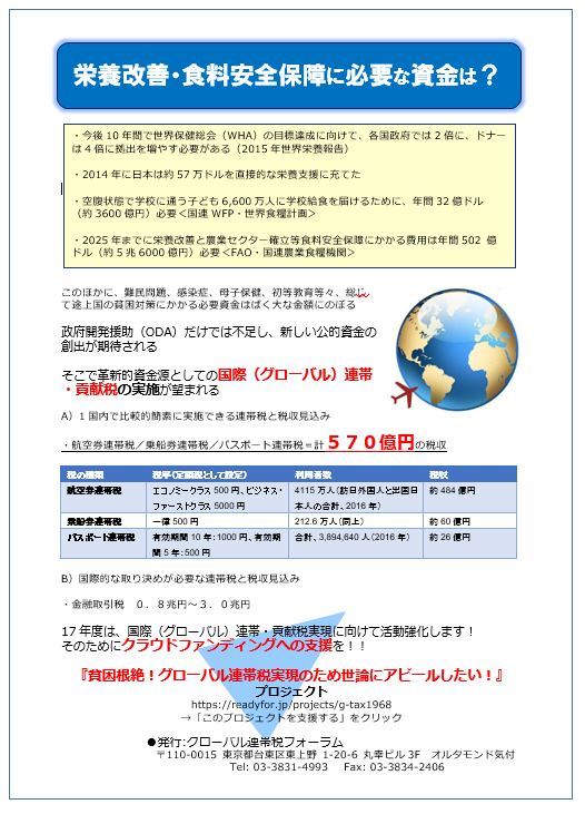 さて、4月17日衆議院第一議員会館で開催された「2016年世界栄養報告(GNR)セミナー」(午前)ならびに「持続可能な開発目標(SDGs)達成に向けた人口と安全保障セミナーⅡ」(午後)の両方に、グローバル連帯税とクラウドファンディングでのプロジェクトを紹介するチラシを300部ほど配布しました。