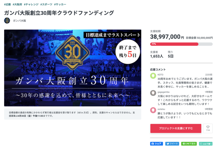 最終日まで、目標の5,000万円に向けてガンバらしく走りきりますので、どうか最後まで皆様のご支援ご協力をよろしくお願いいたします。