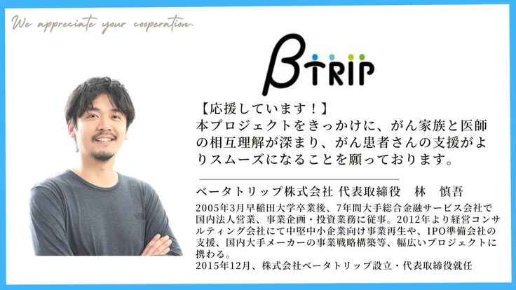 がん患者さんの治療とがん家族の生活をより良いものにするために発信を続けていきたいと思います。