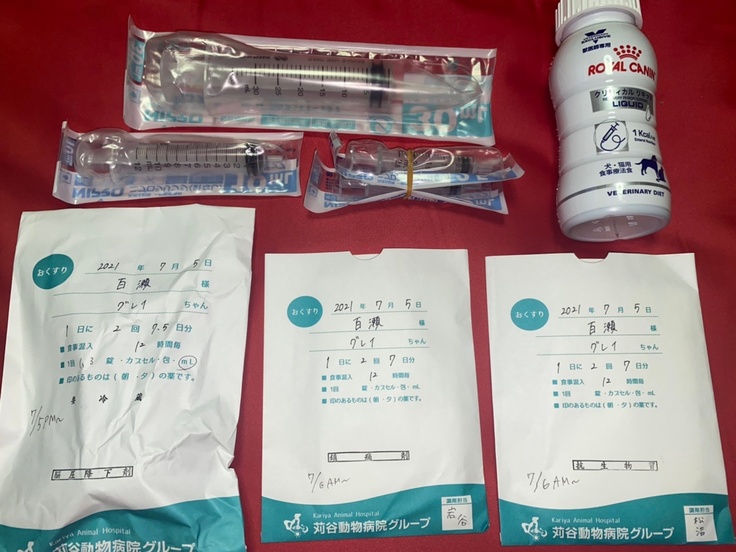 すぐに転院先へ連れて行けないため強制給餌のやり方を教わり、自宅で投与するための脳圧降下剤、抗生物質、鎮痛剤、流動食を受け取り連れて帰ります。