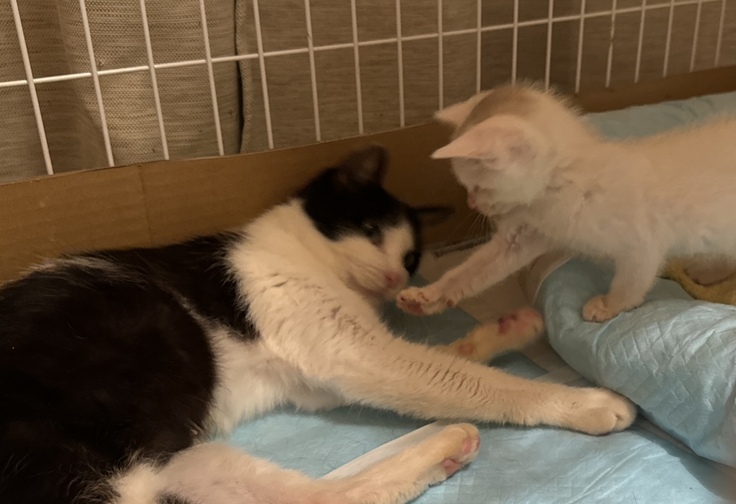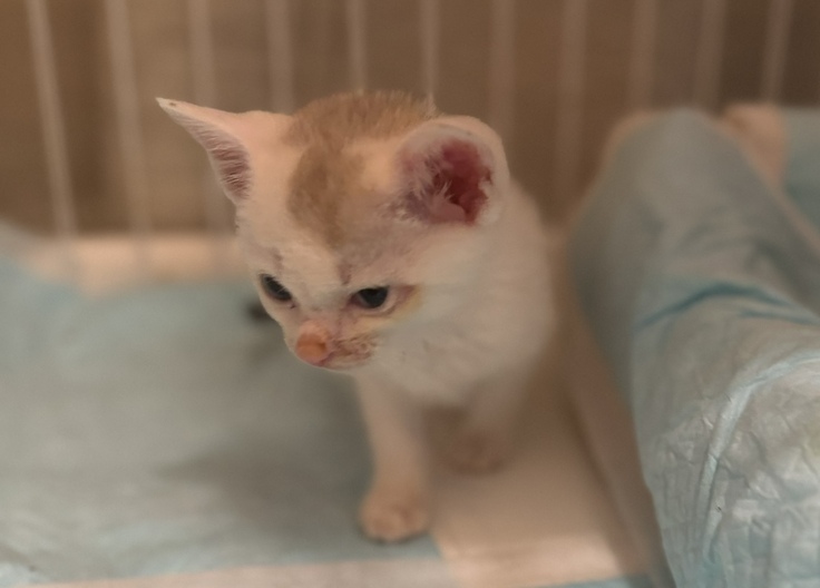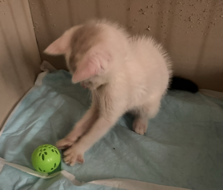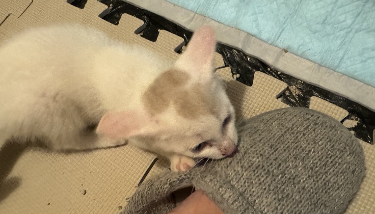 ケージに入れてあげたボールをジッと狙って飛びついたり、私のスリッパに被りついたり、普通の仔猫らしい反応が沢山見られるようになりました。
