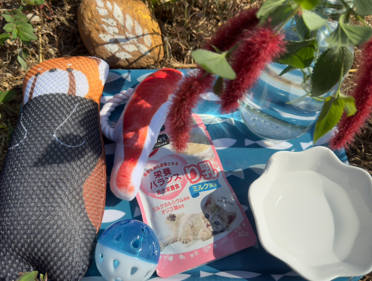 今日は、シンバの亡き兄弟たちのために作った庭の小さなお墓に、離乳食や水、おもちゃを供えてお盆のお参りをしました。