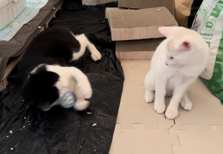 今日のお供えのお下がりのおもちゃで、シンバとアテネは楽しそうに遊んでいます。シンバがボールをアテネにパスすると…それまでシンバが遊ぶ姿をジッと見守っていたアテネが大興奮!アテネも遊びたかったようです。