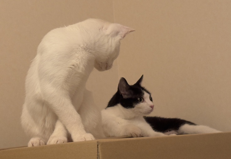 心配したアテネの避妊手術後、シンバへの接し方も手術前と変わらず、遊ぶ隙を見ながらシンバの毛繕いをしています。