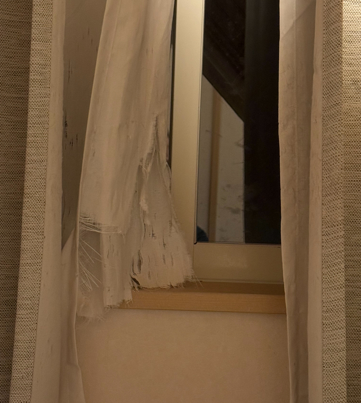さらに…最初は小さな穴だったのが、窓の額縁部分から下が破れて、今ではササッと窓パトロールができるカーテンに仕立てられていました。