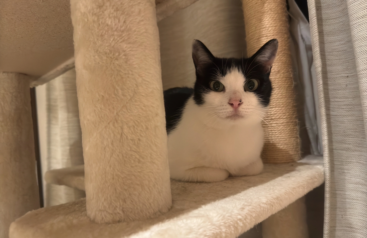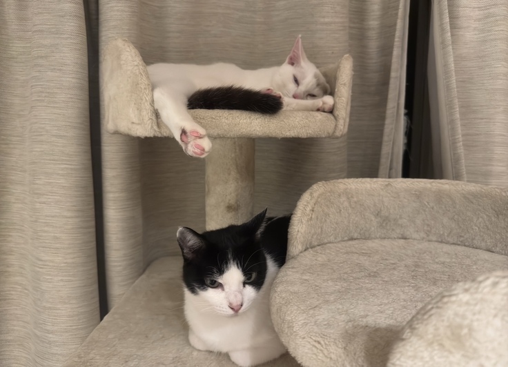 最初はアテネもかなり緊張していましたが、シンバが楽しそうにおもちゃで遊び回る姿を見て、少しずつリラックスしてきました。そして、思ったよりも早く、キャットタワーでくつろいだり窓から外の景色を眺めたりしながら、落ち着けました。