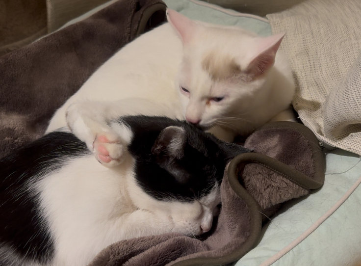 食後にアテネをブラッシングしていると、シンバが隣に寝そべり、アテネの毛を丁寧に舐めているのです。まるで「お母さん、いつもありがとう」と感謝の気持ちを表現しているようで、その姿を見てとても嬉しくなりました。