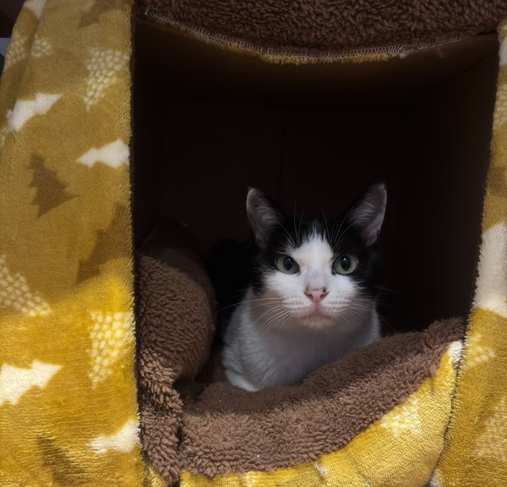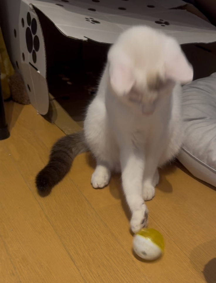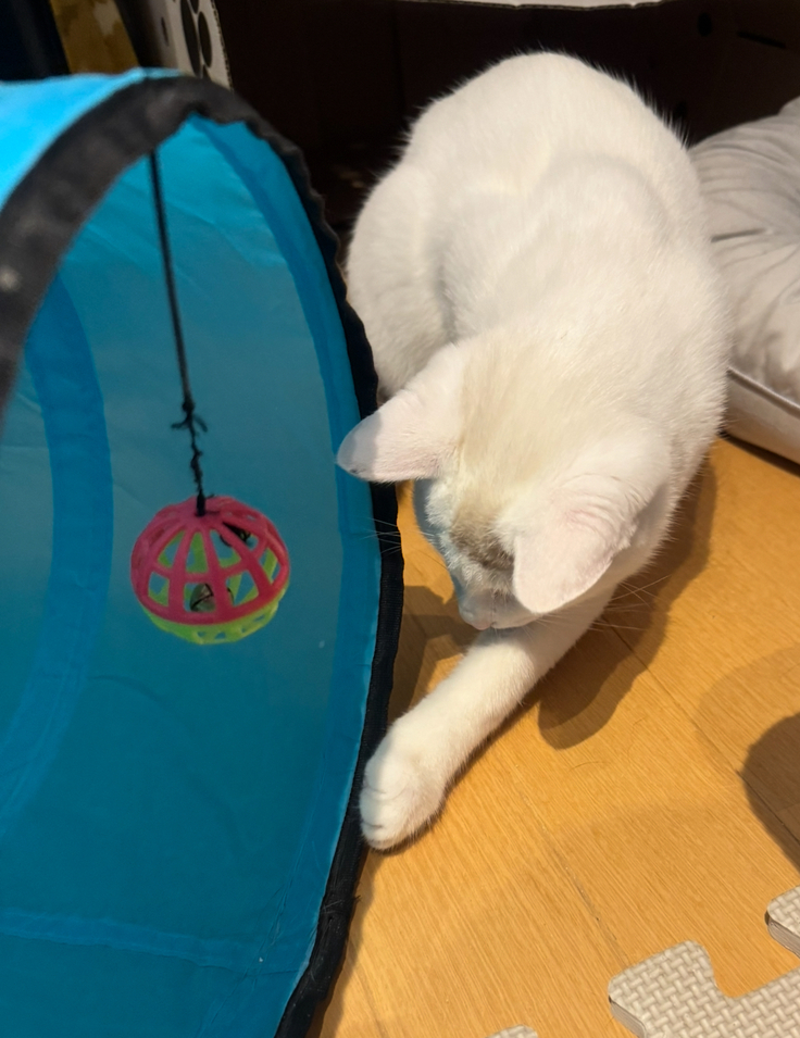 アテネは、お昼ご飯後のブラッシングが終わってからは、楽しそうにオモチャで遊ぶシンバの側に移動して見守っていました(先住猫たちが使わなかった、こたつの形のベッドを気に入って使ってくれています!)