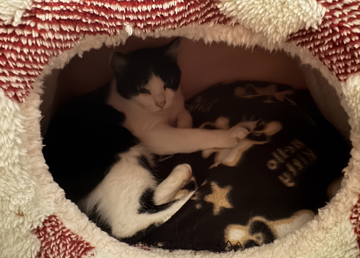 朝晩冷えるようになってきたので、シンバとアテネのために、ドーム型の温かいベッドを買ってみました。まずアテネが試しに入ってくれて、快適そうにしていました。いつものように、シンバはそのアテネの様子を少し離れて見ていました。