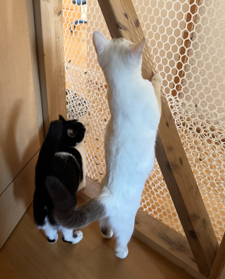 すると、シンバもアテネも嬉しそうで、メッシュドアの側から離れません。シンバはアテネがそばにいる安心感からか、とても強気で、先住猫が近づいても怖がることなく、「お兄ちゃん!」とでも言っているかのようです。アテネもまた、先住猫がいる側に出たそうにしています。