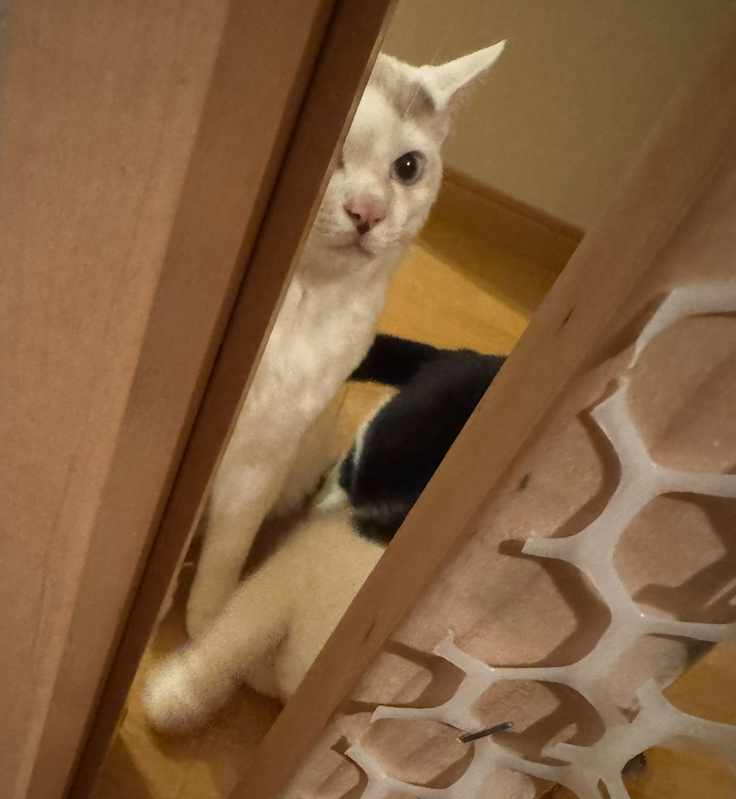 さて、昨日はシンバとアテネがメッシュドア越しに次男猫と触れ合う時間がありました。アテネは大喜びで、「クルクル、キュルル」と鳴きながら「もっと近づきたい!」と精いっぱいドア越しに次男猫に近づいていました!