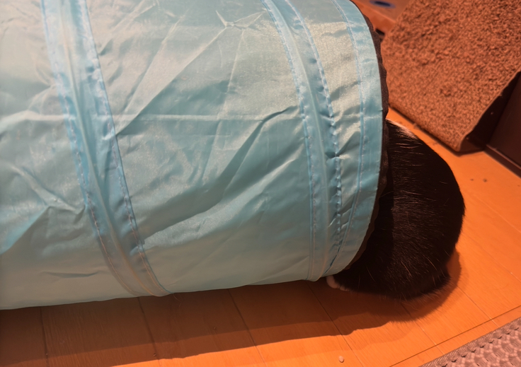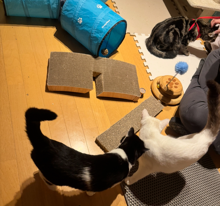 シンバも次男猫の前で大好きなオモチャで遊びながら、まるで「一緒に遊ぼう!」と誘っているようでした。次男猫もシンバが遊び終えたオモチャで「これ、こうやって遊ぶんだ!見てな!」と言わんばかりに遊び始めました。そして、眠くなったシンバはキャットタワーの定位置からあくびをしながら、次男猫が遊ぶ姿を見ていました。アテネも次男猫をトンネル遊びに誘っていました!