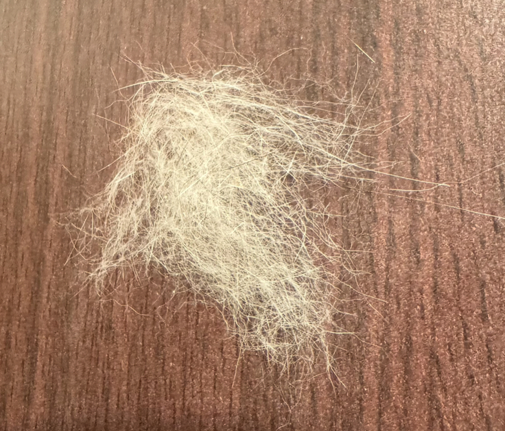 掃除をしている中で、シンバの赤ちゃんの頃の毛を見つけました。小袋に入れて大切に保管しています。