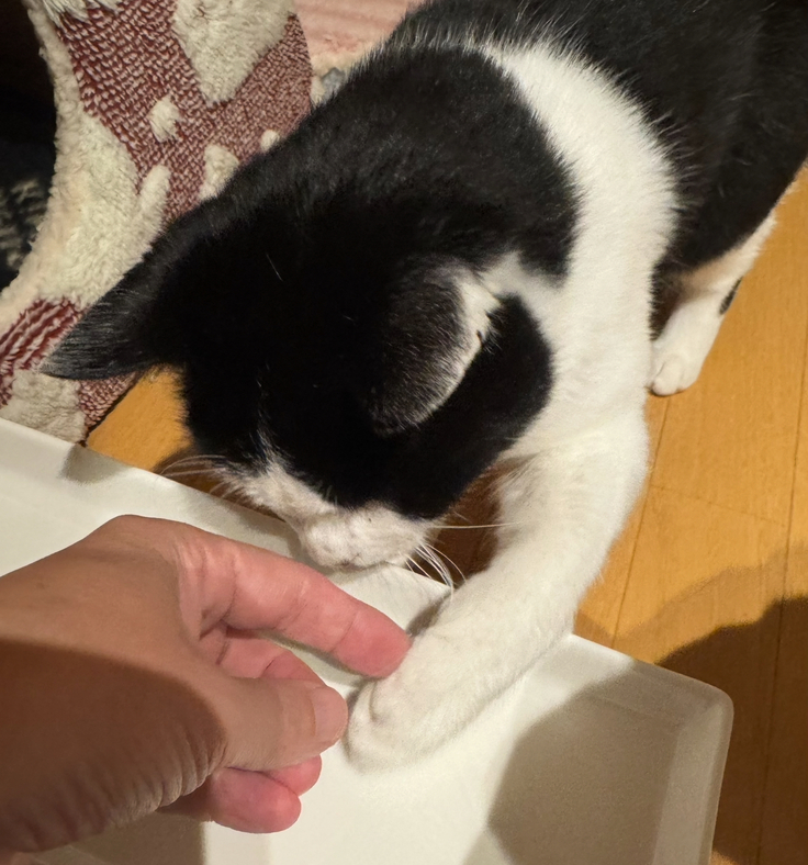 早食いのアテネには、一粒ずつゆっくりあげるようにしています。あるとき私の指とアテネの手が触れたことがあり、たまたま指が触れた後に一粒あげるタイミングになったんですが、ハイタッチのような可愛らしい動作をするようになりました。「ハイタッチでご飯がもらえる!」と思ったようで、小さな手で可愛く触れてきます。今日はその手を撫でたら、「ご飯、早く!」と頭突きされました(笑)。